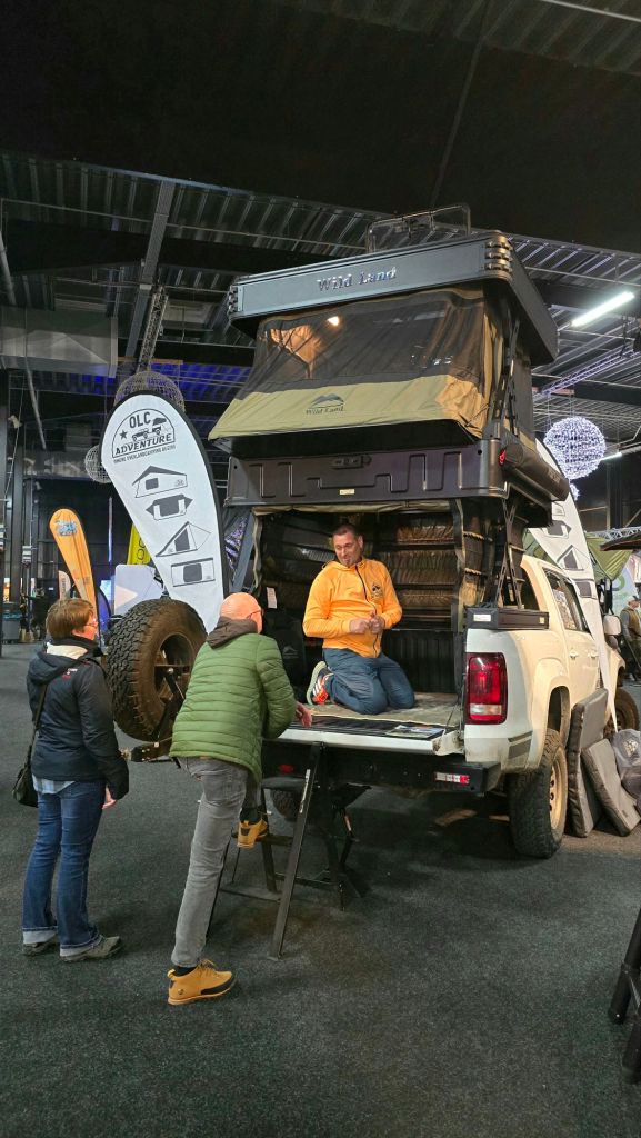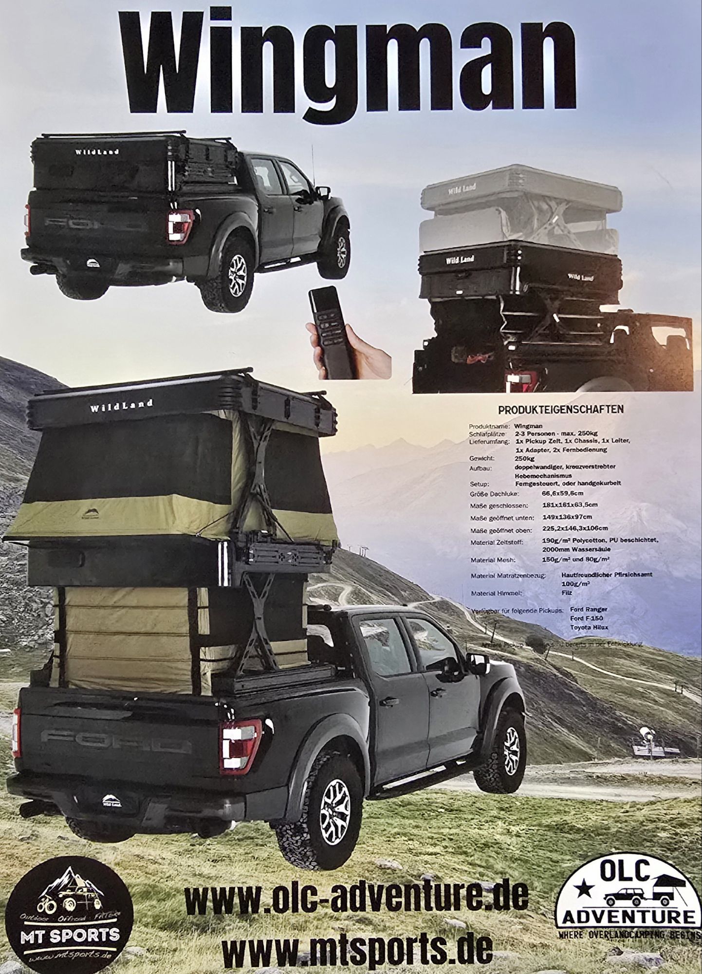 And what is this? Eine weitere Innovation gab es auf dem Gemeinschaftsstand von OLC Adventure und MT Sports. Für dieses neuartige Produkt gibt es noch gar keine Kategorie. Eine Mischung aus Dachzelt, Canopy-Camper und Hardtop Lösung. Genannt „Wingman“. Umso mehr freut es mich, dass Markus den Exklusivvertrieb für Europa innehat. Zusammengefahren ist es nicht höher als ein Hardtop. Über zwei Scherenmechanismen fahren die zwei Etagen in schwindelerregende Höhen. So hat man im unteren Abteil Wohnraum und Stehhöhe. Über eine Leiter klettert man wie bei einem Caonopy-Camper ins Schlafgemach und hat einen genialen 360° Rundumblick. Eine echte Innovation.