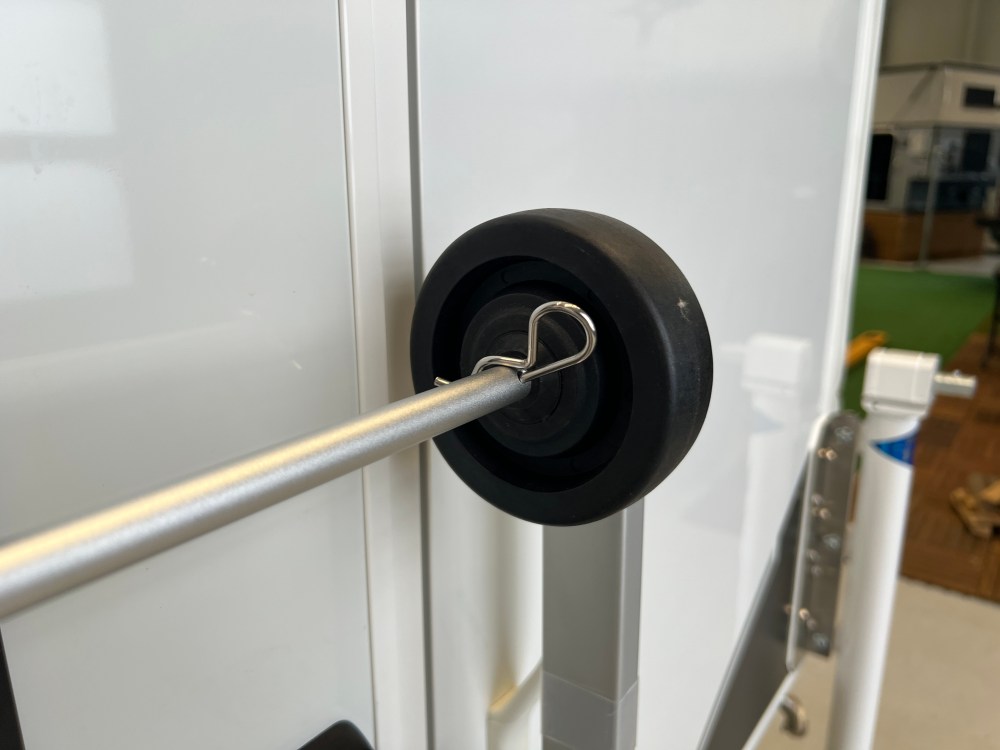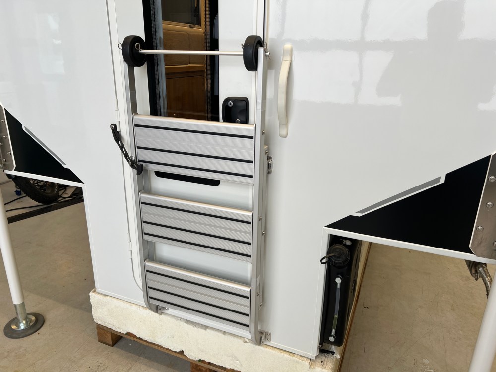 Die dreistufige, drehbare Klappleiter verfügt nun über robustere Vollkunststoffrollen und ist für den stationären Betrieb auf dem Campingplatz abnehmbar. Die breiten Trittstufen gefallen mir besonders, denn so kann man auch mal barfuß sicher in die Kabine steigen.