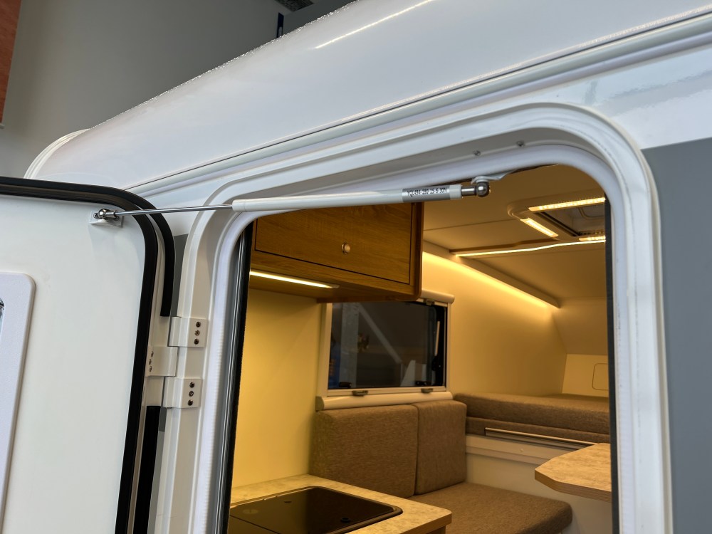 Die Zarge der Eingangstür wurde im unteren Bereich abgerundet, was den Wasserablauf verbessert. Zudem ist die Tür nun mit einem Dämpfer ausgestattet, der sie ohne äußeres Einhaken offen hält, und sie verfügt über eine Doppeldichtung.