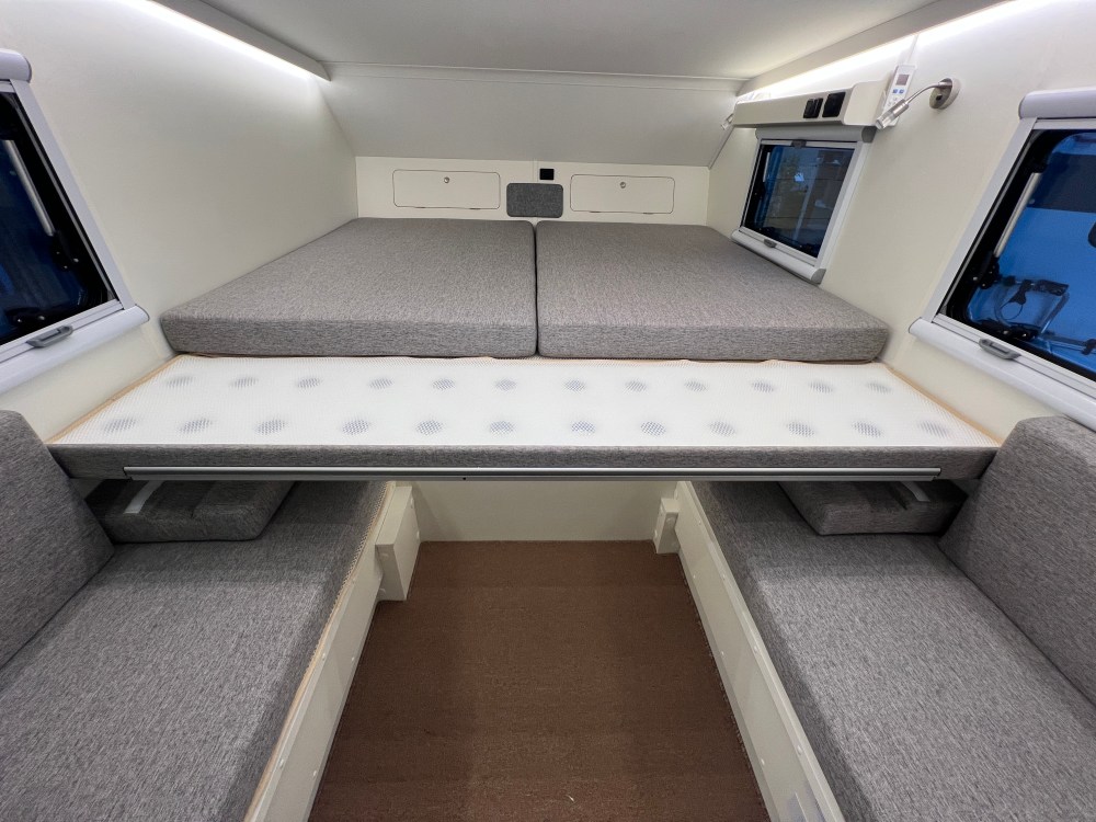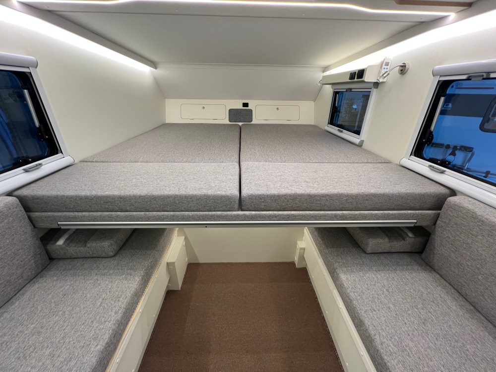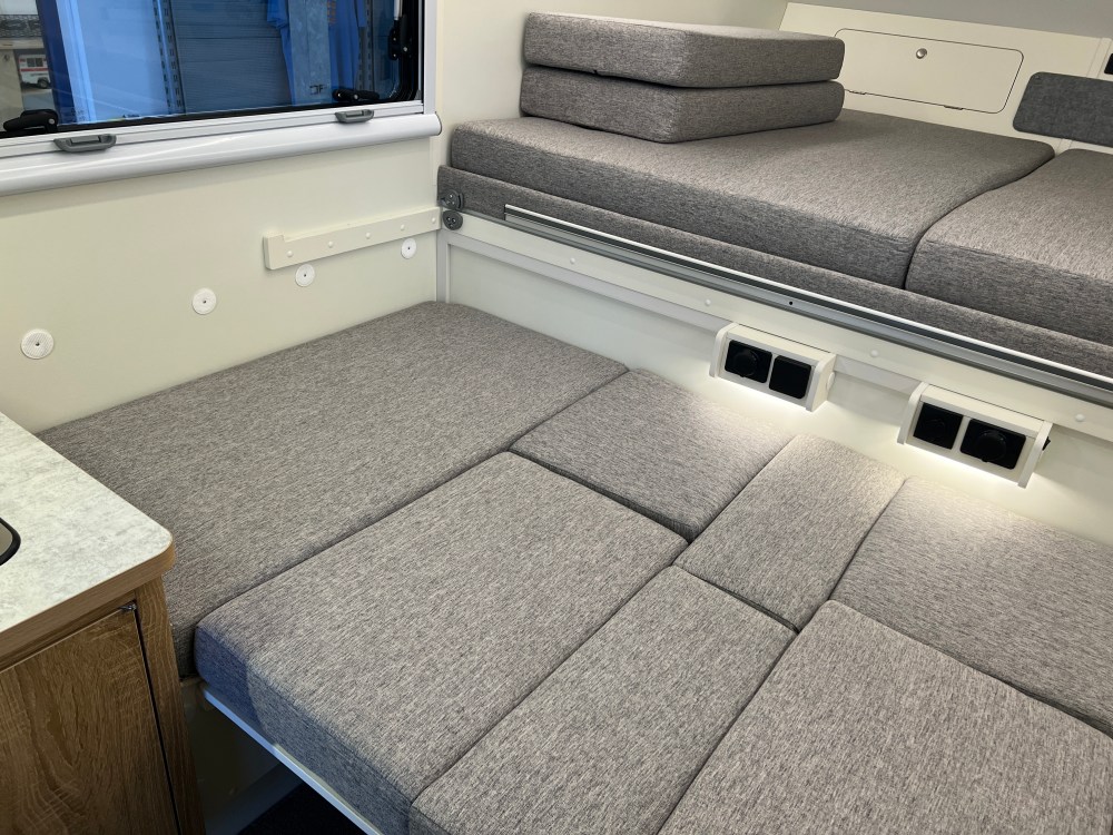Besonders ist das flexible Schlafsystem: Das Bett lässt sich von einer Längssitzgruppe in eine Liegefläche von 2 x 2 Metern verwandeln. Dann kann man sich überlegen ob man je nach vorliebe längs oder quer schlafen möchte.