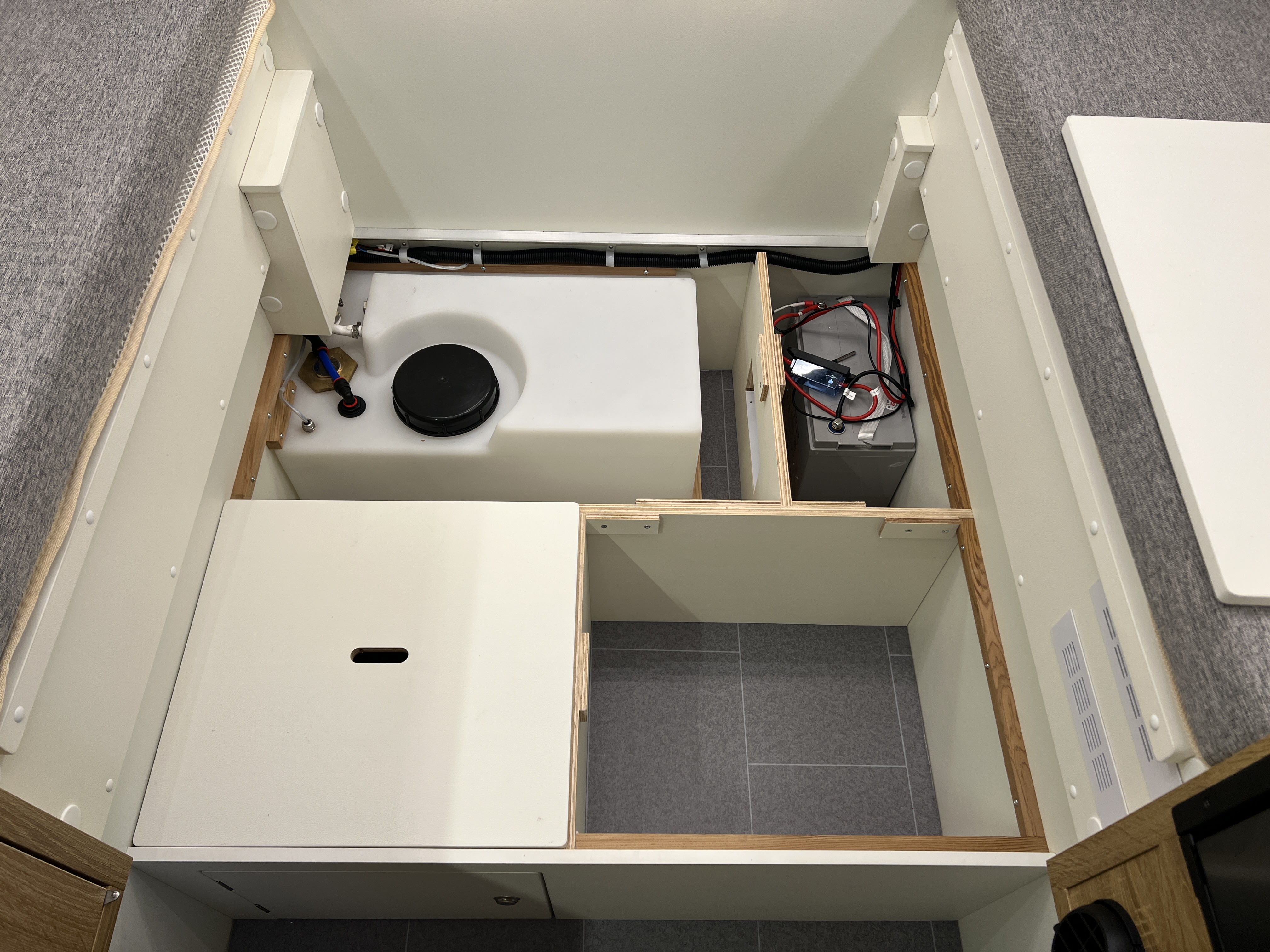 - 10L Abwassertank, mit Entleerung unter der Kabinenflanke