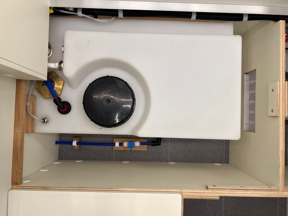 65L Frisch- und 10L Abwassertank, mit Entleerung unter der Kabinenflanke sorgen für eine ausreichende Wasserversorgung.