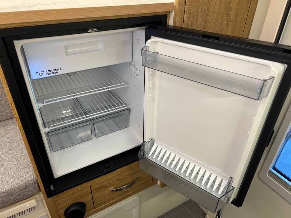 Der Küchenbereich wurde ebenfalls überarbeitet: Der Dometic NRX Kühlschrank verfügt über ein herausnehmbares Gefrierfach, und die Oberschränke erhielten schlankere Rahmen für einen besseren Zugriff.