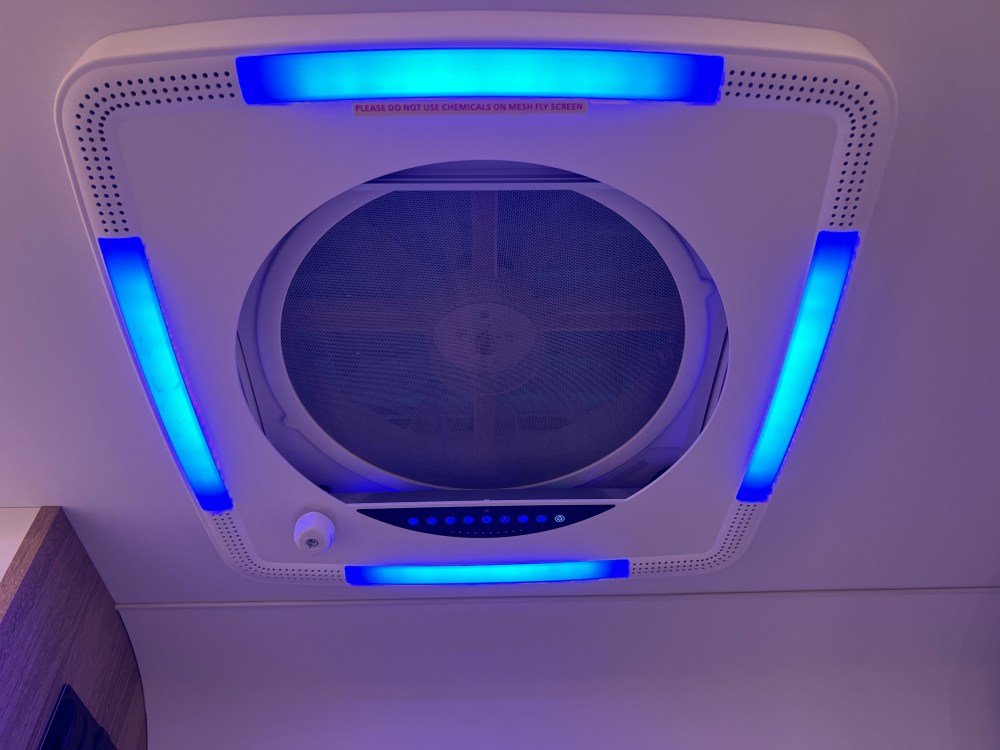 Die technische Ausstattung im Innenraum umfasst ein durchdachtes Lichtkonzept mit dimmbaren LED-Streifen, das bequem per Fernbedienung gesteuert werden kann. Zahlreiche Lademöglichkeiten (USB-A und USB-C) sind sowohl an der Sitzgruppe als auch direkt am Bett und an den Leselampen vorhanden. Ein neues technisches Highlight ist der Ranger Deckenventilator, der auch bei Regen genutzt werden kann und die Luft in der Kabine hocheffizient umwälzt.