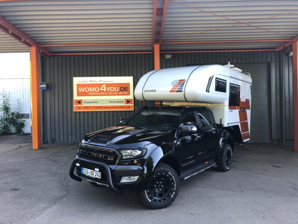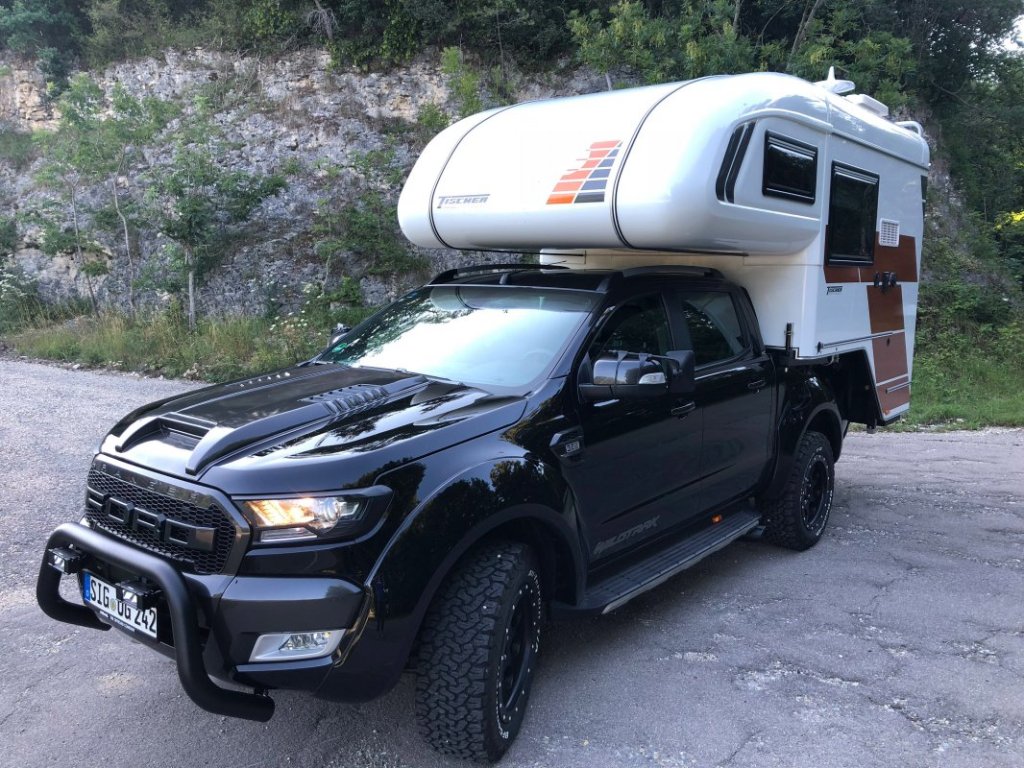 Die Firma Tischer fertigt seit Anfang der 70er Jahre hochwertige Wohnkabinen. Das Familienunternehmen mit Firmensitz in Kreuzwertheim produziert mit 30 Mitarbeiter jährlich 180 hochwertige Absetzkabinen für alle auf dem deutschen Markt erhältlichen Pickups. Und so auch das Model 230. Hier finden 4 Personen Platz und die empfohlene Belegung ist 2 Erwachsene und max. 2 Kinder. Die Sitzgruppe lässt sich mit wenigen Handgriffen ebenfalls zu einem weiteren Bett umfunktionieren. Auch hier gibt es wieder das volle Programm: Komplette Geschirrausstattung inkl. Töpfe, Gläser, Besteck, Wasserkocher etc., Markise, Tisch & Stühle. Und die Differenz vom Fahrzeuggewicht (3000 kg reisefertig) zum zulässigen Gesamtgewichts vom Ford Ranger (3480 kg ) erlaubt eine Menge Zuladung. Weitere Eckdaten: 90 Liter Frischwasser, Dusche, WC, Kochfeld, Fahrradträger etc. und eine angenehme Stehhöhe von 195cm