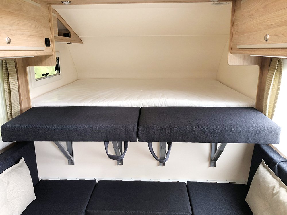 Der 1,5 Kabiner Nissan Navara, mit seinem 163 PS ist völlig ausreichend, um die größere Tischerkabine 260 S vier Personen in den Urlaub zu transportieren. Das S steht für Seiteneingang. Der Wohnraum verfügt über genügend Platz zum Schlafen, Wohlfühlen und für gemeinsame Aktivitäten, wenn das Wetter einmal nicht mitspielt. Eine Bordküche, gemütliche Sitzplätze für 4 Personen, große Betten, 1,95 m Stehhöhe, viele Stauschränke und ein Waschraum mit WC und großem, klappbarem Waschbecken sorgen für ausreichenden Komfort. Ein 90 Liter Frisch und ein 45 Liter großer Unterflur-Abwassertank sorgen für Autarkie. Und Fahrräder können auch noch mitgenommen werden….